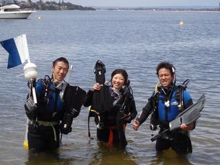 写真は2人の先輩ダイバー(ダイブマスタートレーニング中)と一緒にばんざーいと記念撮影