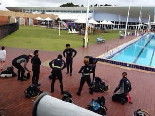 この日は、ダイビングの実習1日目、プール講習でした。