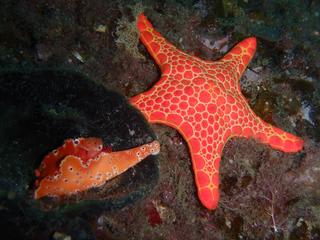 オレンジ色が鮮やかな「モザイク・シー・スター」と「ウミウシ(ケラトソマ・ブレヴィカウダツム)」