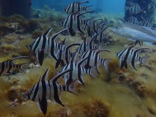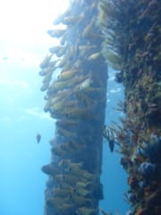 水中から見る柱はとても綺麗で、そこに棲みつくたくさんの魚を見ることができます。