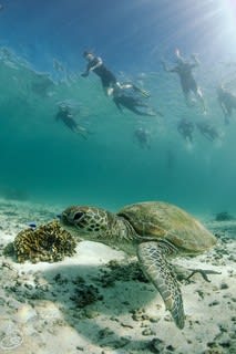 シュノーケルポイントでは、ウミガメやカラフルな魚たちがサンゴの周りを泳いでいました!