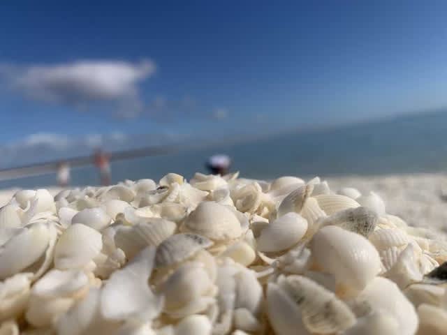 真っ白い貝殻がビーチ一面に広がって、サングラスがないと眩しいくらいです!