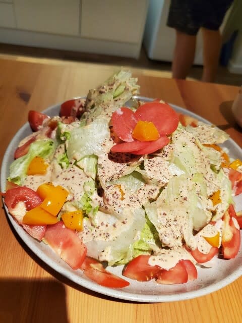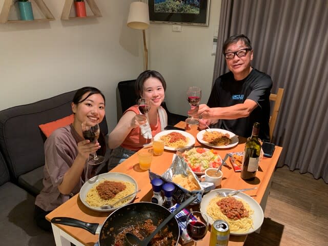 エクスマウスでの初日の夕食は、サラダとミートパスタ🍝、ワインで乾杯!🍷